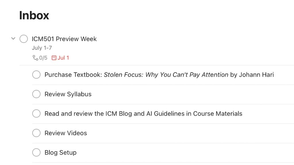 The first step was putting my course layout into Todist. I created tasks for every module so far in my ICM501 course: Preview Week and Learning Modules 1-4. This allowed me to have a dedicated space for all course-related tasks.