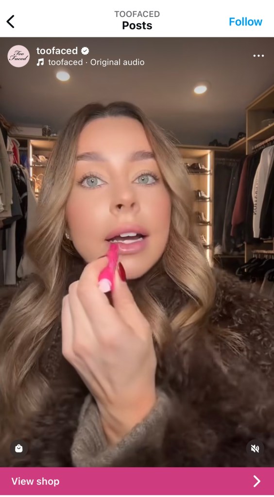 Currently Too Faced is running paid ads particularly on Instagram featuring macro-influencers trying out different products of theirs. The influencers are seen showing the products and the different variations they come in, followed by what the products look like on, and their opinions of it. Too Faced has multiple videos like this spread throughout their page with their shop attached to the video for instant access.