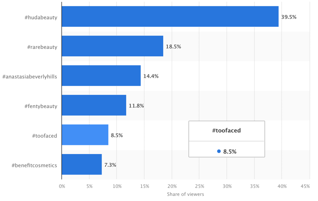Another important metric for Too Faced is shareability. As mentioned in The 21 Essential Social Media Metrics You Must Track for Success in 2024 by Chloe West, shares increase organic reach, extending the brand’s visibility without additional cost. Too Faced’s use of trending TikTok sounds and Instagram Reels encourages followers to share content with their friends and followers, further expanding their audience, as well as using familiar faces (influencers) testing out their products. According to Statista, between January and September of 2023, “#toofaced” was the 5th most viewed beauty brand with an 8.5% share of viewers.