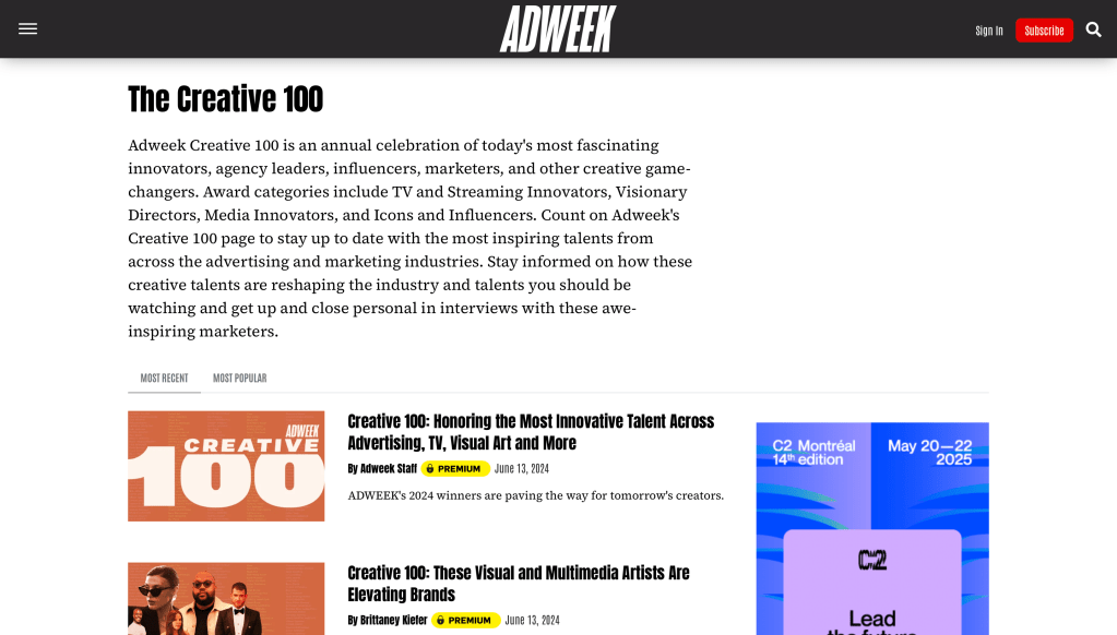 - Adweek’s Creative 100 List (For Campaign Inspo)